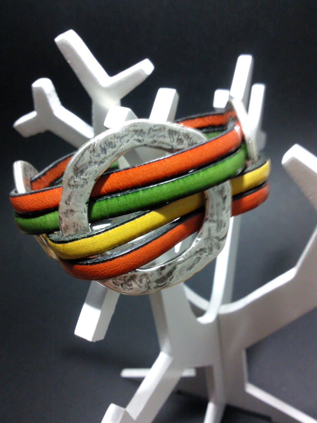 Pulsera realizada en cuero y zamak, y cierre de imán. Se realiza por encargo en colores y medidas deseadas.